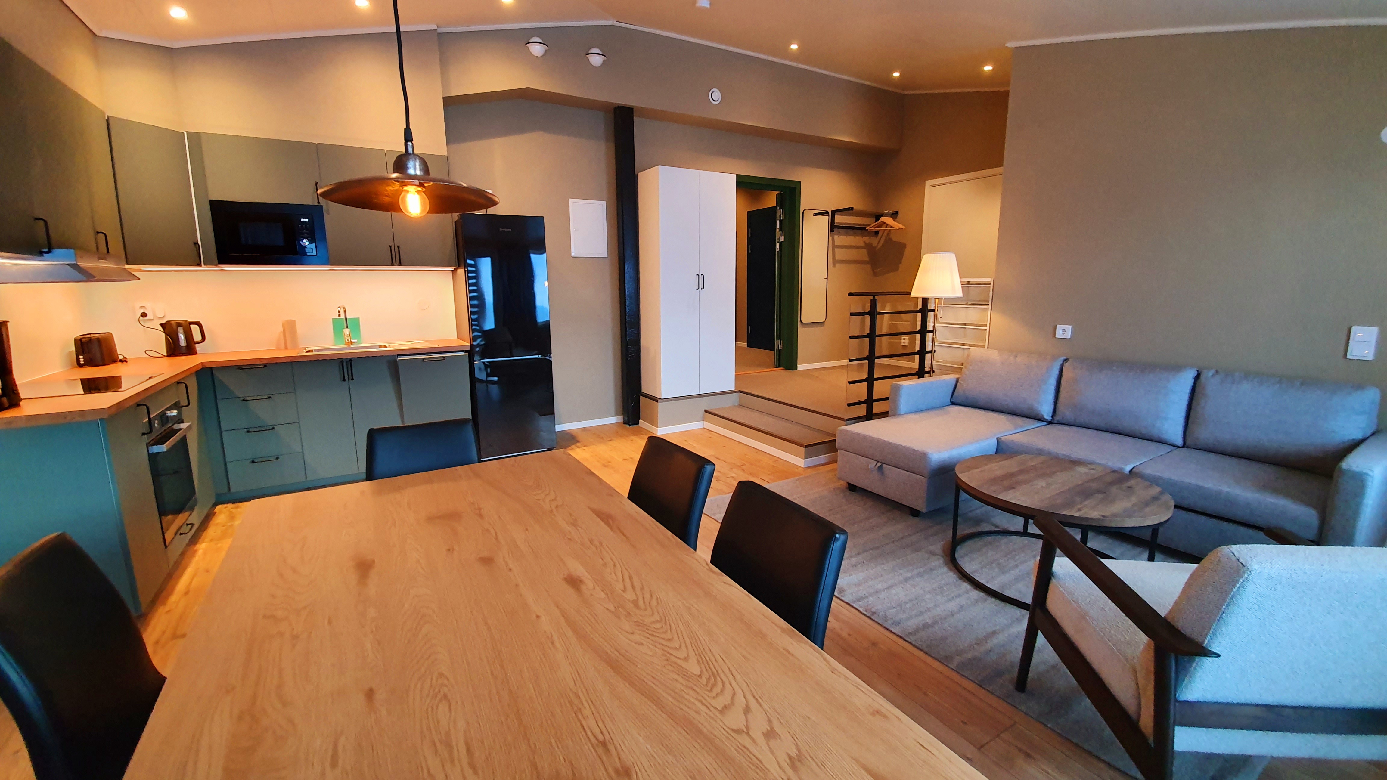 The apartments are practical and comfortable, newly built ahead of the 2024 winter. Each apartment accommodates up to 6 people. Two separate bedrooms and a sofa bed in the living room. The kitchen is fully equipped and the bathroom has a shower and WC. The apartments range from 54 to 62 square meters and come with either a balcony or a spacious terrace. The guests have acces to a shared sauna outside the building (there is a timesheet to reserve the sauna). Car and snowmobile parking is free, right outside the building. The apartments are within walking distance of the ski resort.